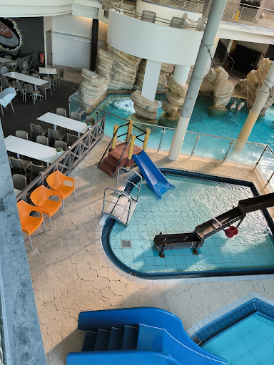 Pros: the pirate ship decoration is very nice kids have interesting things to discover the food is tasty and there are also healthy options kids can enter a pirate ship there is an aquarium with fishes that you can see from above and under water inside the cave of the main pool the loungers are well spread out and in quiet areas so you can have a bit of privacy the woman's showers on the top floor have a high chair / bathtub combo for babies up to 11 kg