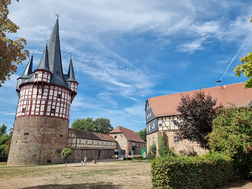 FĂŒr Fachwerkliebhaber wie mich, wirkt der Turm wie ein Magnet, denn so ein Bergfried wurde normalerweise aus Stein errichtet. Nach einer kurzen Recherche wird mir dann auch klar, dass es sich offensichtlich um gröĂten erhaltenen Fachwerkrundbau der Welt handelt. Der untere Teil des Turmes ist natĂŒrlich aus Stein, aber seine eigentlich Höhe von 48,40 Meter hat er maĂgeblich der Fachwerkkonstuktion und seinen TĂŒrmen zu verdanken.