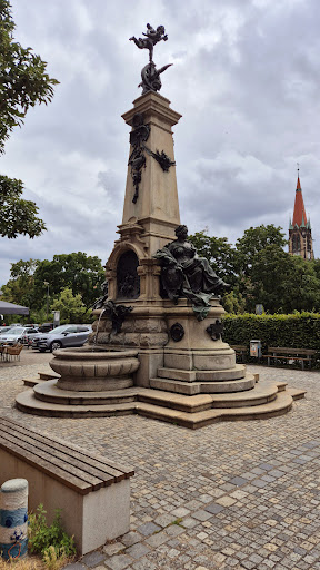Read moreMan steht vor dem Ludwig-Eisenbahn-Denkmal und merkt: Hier wurde nicht einfach einer Lok gedacht – hier wurde sie beinahe vergöttert. Allegorien wetteifern mit Bronze-Adlern um Aufmerksamkeit, während ein Genius auf einem Flügelrad balanciert, als wäre Bahntechnik ein göttlicher Funke. Der Brunnen plätschert dezent, als wolle er sagen: „Ja, das war wichtig – und ja, das bleibt so.“ Man schaut, staunt – und denkt: Für eine Fahrt von Nürnberg nach Fürth hat man hier erstaunlich viel Pathos auf Lager. Aber charmant ist es eben doch.
