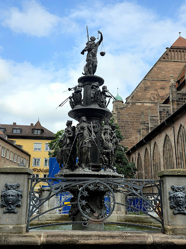The Tugendbrunnen (Fountain of Virtue), cast by Benedikt Wurzelbauer in the 1580s, combines Christian and classical ideals in bronze, with figures of Faith, Love, Hope, Courage, Temperance, and Patience rising toward Justice at the top. Once a working water source for the Lorenzer quarter, it was as practical as it was symbolic.