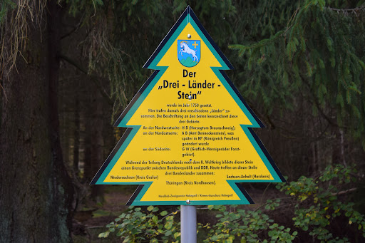 Read moreGrenzstein Niedersachsen - Sachsen-Anhalt - Thüringen; mehrere Schautafeln informieren über die Geschichte der innerdeutschen Grenze, die hier verlief und den Naturraum Wald. Sonderstempelstation der Harzer Wandernadel. Für Eltern mit Kinderwagen: zum Stempel kommt man über den Betonplattenweg der Grenze ganz bequem. Von dort kann man einen kleinen Abstecher südwärts zum Drei-Länder-Stein machen. Man muss sich nicht unbedingt dem Wegweiser entsprechend auf einem kleinen Pfad durch den...