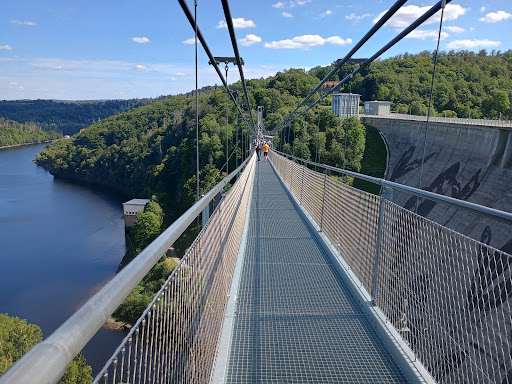 Read moreDirekt vor der Rappbode-Talsperre wurde 2017 eine der längsten Seilhängebrücken eröffnet. Die Brücke ist gut zu erreichen und es ist ein ausreichend großer Parkplatz vorhanden. Parkgebühren werden durch eine elektronische Kennzeichenerfassung ermittelt. Hier gibt es jedoch einen Punkt Abzug, denn das System hat unser ausländisches Kennzeichen gar nicht erfasst. In dem Fall erscheint bei Eingabe des Kennzeichens am Automaten eine Fehlermeldung und man soll sich an die Hotline oder das Besucherzentrum wenden. Das Besucherzentrum ist jedoch montags (wir waren an einem Montag dort) geschlossen und nun solle man eine 0180er Nummer anrufen. Leider ist diese Hotline mit ausländischen Simkarten nicht anrufbar. Somit konnte uns nur die nette Dame im Harz Regio Shop weiterhelfen. In Falle einer fehlerhaften Kennzeichenerfassung muss man am Automaten einfach ein 2,50 € Ticket (3 Stunden) vor der Ausfahrt kaufen und an der Ausfahrt dann per Rufknopf Hilfe anfordern und dort das Ticket in die Kamera halten. Dann wird man rausgelassen. Das hat dann gut funktioniert, aber die Rennerei vorher muss nicht sein. Vielleicht hilft das hier einigen weiter, die mit ausländischen Fahrzeuge unterwegs sind. Zurück zur Brücke - wir waren an einem sehr ruhigen und sonnigen Tag im Mai dort. Die Brücke schwankte etwas, aber nichts wirklich gefährliches. Der Ausblick ins Tal ist wirklich beeindruckend bei solch gutem Wetter. Alle paar Minuten stürzen sich wagemutige per Seilrutsche ins Tal hinab, was teilweise witzig anzusehen ist durch die Audiokulisse in Form von Freudenschreien. Für die 458m lange Brücke benötigt man ca. 45 bis 60 Min., wenn man gemütlich rübergeht und ab und an mal die Blicke schweifen lässt. An der Nordseite angekommen hat man die Wahl über die Staumauer der Rapbode-Talsperre zurück zu gehen oder einfach die Brücke zurück zu gehen. Wir haben die Brücke genommen, da man so neben dem großartigen Talblick auch immer wieder den imposanten Blick auf die Staumauer hat. Auf der Brücke selbst finden sich einige interessante Informationstafeln zur Brücke, sowie zur Talsperre. Ebenfalls auf der Brücke sind alle 30 bis 40m Lautsprecher, die permanent Radio spielen zur musikalischen Untermalung. Ist nett gemeint, aber die Brücke würde auch ohne Musik schon begeistern. Alles in allem eine schöne Sache und...
