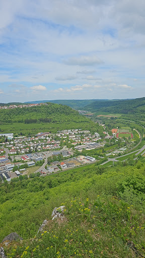 Pokud ale vytrváte a vystoupáte dalších 250 metrů, otevře se před vámi dechberoucí výhled na celé Oberkochen a okolní krajinu. Nahoře se nachází dřevěný kříž s postavou Ježíše – místo působí jako malé poutní zastavení. Pod skalním výčnělkem najdete také malý oltář s soškou Panny Marie, který dotváří celkovou duchovní atmosféru místa.