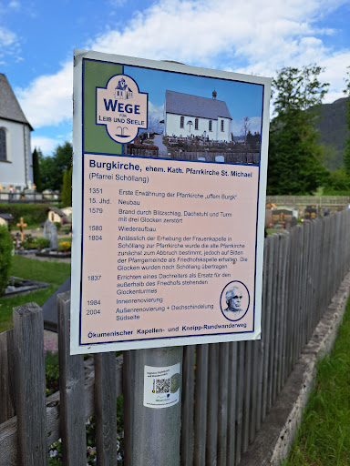 Read moreSchöne Kirche auf erhöhter Lage. Die kleine Wanderung von Fischen (Bahnhof) aus führt am Hotel Burgmühle vorbei, durch den öffentlichen Kräutergarten, über den Fluss Iller und ist gut beschildert. Dauer ca 40 Minuten. Am Fuße des Hügels der Burgkirche teilt sich der Weg dann auf. Wer gut zu Fuß ist sollte den steilen Aufstieg nehmen. Dieser ist auch für Kids spannender. Einmal oben angekommen wird man mit einem tollen Ausblick auf die Berge und Fischen belohnt. Die Kirche selbst kann ebenfalls besichtigt werden. Es ist übrigens keine Burgruine oder ähnliches vorhanden. "Burg" leitet sich hier (laut Beschreibungstafel an der Kirche selbst)...