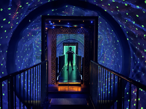 Es fing an mit einem tollen Spiegelglas-Labyrinth an, was echt Spaß gemacht hat. Es folgten ein paar Räume wo es noch Spiele und Aktionen gab. Dann kam man in die eigentliche Halle mit Restaurant, Kletterpark, Hochseilgarten und diversen anderen Aktivitäten wie Goldschürfen, Hüpfburg, Rollenrutsche, dem ultra großen Bällebad mit Rutsche usw.