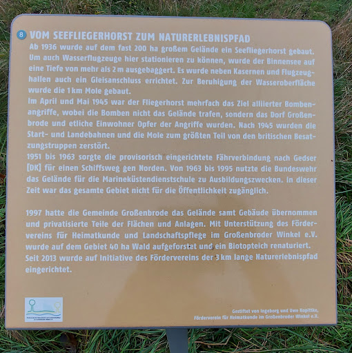 Hier wurden ab 1998 rund 40 ha Ackerfläche und das Gelände des ehemaligen Seefliegerhorstes aufgeforstet. Darauf folgten 8 ha Streuobstwiesen und Wildobsthecken sowie ein 3.000 m³ großes Feuchtbiotop. Bereits hier gab es erste Lern- und Hinweistafeln. Der umfangreiche Naturerlebnispfad in seiner jetzigen Form resultiert allerdings erst aus Konzepten des Jahres 2013. Der Förderverein für Heimatkunde und Landschaftspflege im Großenbroder Winkel e.V. (FHL) hat auf einer rd. 3 km langen Strecke 20 Spiel- und Lernstationen errichtet. Ein schöner Spazierweg etwas abseits der "Touristenmeile" und für Kinder alker Altersklassen ein gelungenes Infotainment. Besonders schön finde ich die Idee des "grünen Klassenzimmers". An einigen Stationen ist allerdings eine Wartung und Instandsetzung erforderlich. So fehlen z.B. die Harke zum Glätten der Weitsprunggrube und der Eichhörnchen-Trittsiegelstempel, weil die Stiele...