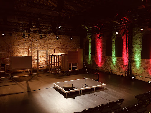 Die Exerzierhalle hat einen Empfangsbereich mit Garderobe, dann geht es die Treppe hinauf zu einer Art Lobby mit Bar (wo es sehr warm ist). Durch einen Vorhang gelangt man dann zu dem angenehm steil bestuhlten Aufführungsraum mit großzügiger Bühne, wo man auch den schön beleuchteten alten Klinker und die professionelle Licht- und Tontechnik bewundern kann.