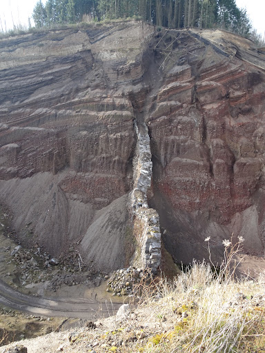 Der Eppelsberg früher schön, inzwischen existiert der auf der Infotafel des Vulkanparks eingezeichnete Weg am Rande des Eppelsberg gar nicht mehr. Es gibt dort nur noch einen Trampelpfad von den Leuten, die den Zaun rund um den angebaggerten Vulkan kontrollieren. Die steilen Wände erodieren nämlich, so dass immer wieder Stücke abbrechen. Wir wurden ermahnt, dass man auf diesem teilweise überwucherten Trampelpfad gar nicht wandern darf. Die Infotafeln auf Basaltblöcken sind teils umgestürzt. Man müsste den Eppelsberg als Station der Vulkanpark-Route aufgeben. Ich spreche nicht vom Traumpfad, sondern von der...