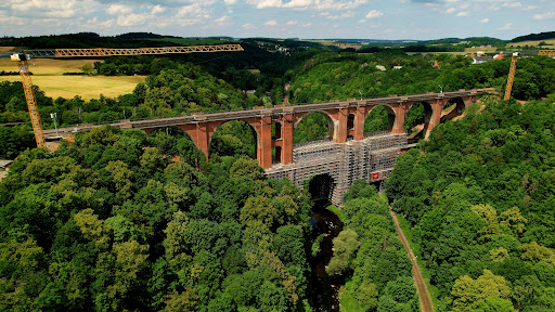 Read moreDie zweitgrößte Ziegelbrücke der Welt unweit der Stadt Plauen im Vogtland hat die Besonderheit, das sowohl darüber als auch darunter bis heute Züge fahren. Daher gibt es - von Plauen aus gesehen - die Obere und die Untere Bahn. Während die "Barthmühle" ein idyllischer Haltepunkt der Unteren Bahn zwischen Weischlitz/Plauen und Gera entlang des Flußlaufs der "Weißen Elster" ist, befindet sich hinter der Elstertalbrücke der Bahnhof von Jocketa, einem recht noblen Villen-Vorort von Plauen, der heute zur Gemeinde Pöhl gehört. Wenn einmal die Restaurierungsarbeiten beendet sein werden, kann die Brücke auf halber Höhe wieder begangen werden. Der Vogtland Panorama Weg führt über die Brücke. Tolle Ausblicke bieten sich aus Richtung Röttis vom König-Albert-Stein oder von der Loreley von Jocketa (Loreleystraße). Hier führt auch ein wunderschöner Wanderweg mit zahlreichen Stufen von Jocketa etwa 400 Meter ins...