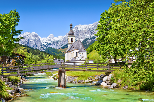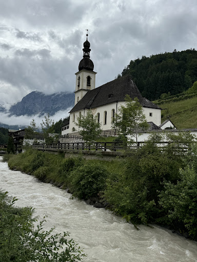 The Parish Church of St. Sebastian is one of the most iconic postcard scenes in Bavaria, set against the backdrop of alpine peaks with the Ramsauer Ache river flowing in front. The classic view is taken from the nearby wooden bridge, framing the white church and green surroundings perfectly.