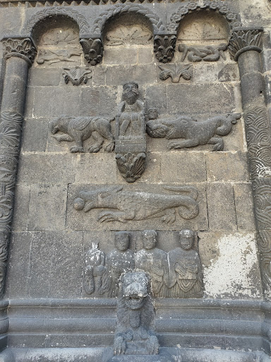 The tympanum above the north portal has busts of Christ, St. James and St. John. The six archivolts are undecorated but terminate in sculptures of seated bears (left) and lions (right) that face the viewer. The six jambs on each side alternate between: 1) columns carved with foliage and geometrical designs and topped with capitals of foliage with faces; and 2) grooved jambs left mostly plain except for awkwardly kneeling human figures carved at the top and bottom.