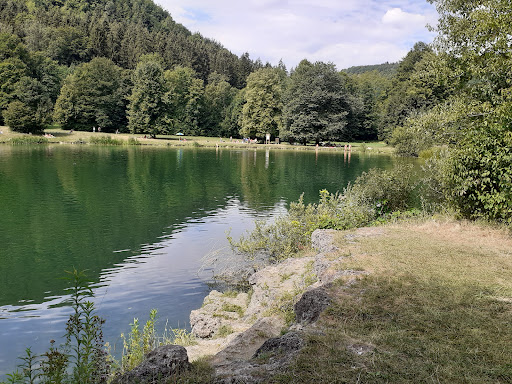 Read moreAktuell 31.07.22- gegen 12.00 Uhr mittags noch recht wenig los. Am ausgetrockneten Flussbett entlang, erreicht man in wenigen Gehminuten, vielleicht ca 400 Meter, den ersten, den unteren Gönninger See. Aktuell ist Baden möglich, zumindest tun es die meisten. Viele Menschen waren mit angeleinten Hunden dort, die sich alle ordentlich verhalten haben. Sehr tolle Möglichkeit um mit der ganzen Familie samt Hund einen richtig schönen Tag am See zu verbringen. Vom Ufer aus geht es seicht ins Wasser, ideal für Kinder, die man selbstverständlich trotzdem aus der Nähe gut beobachten sollte . Das Wasser war schön klar, die Naturerlebnisse zauberhaft. Flora und Fauna wunderbar. Eine Entenfamilie schwamm am Schilf entlang und von der gegenüberliegenden Seite, von ganz oben auf den Felsen, hat man einen super Blick über den See. Wanderwege führen direkt am See vorbei, die auch von Fahrradfahrern genutzt werden, aber die Rasenfläche ist groß genug um irgendwo ein etwas ruhigeres Plätzchen zu finden, wenn man nicht direkt am Seeufer liegen muss. Aktuell 7.8.22: schade, dass es trotzdem Hundebesitzer gibt, die ihren Hund...