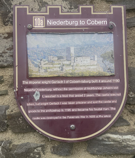 Read moreDie Niederburg wurde Mitte des 12. Jahrhunderts gegründet, erstmals erwähnt 1195, als der damalige Burgherr sie mitsamt der Oberburg dem Trierer Erzbischof als Lehen auftrug. Die Besitzer, die Herren von Isenburg-Kobern, starben dann im 13. Jahrhundert in weiblicher Linie aus. Über die Erbtochter Cecilia gelangten die Burg zusammen mit der Oberburg und der gesamten Herrschaft an Friedrich II. von Neuerburg. 1309 starb dann auch diese Linie aus. Danach wurden Burg und Herrschaft an den Trierer Erzbischof verkauft. Die Burg wurde schließlich im Zuge des Pfälzischen Erbfolgekriegs 1688 zerstört.