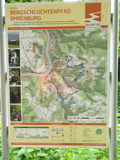 Bergschluchtenpfad Ehrenburg ... durch grandiose Landschaften an den Steilhängen der Mosel, tiefe Felsschluchten, entlang quirliger Bäche, hinabtauchen ins Mittelalter auf der wildromantischen Ehrenburg, gekrönt durch spektakuläre Ausblicke auf Mosel und Moseltal. Highlights Felstrog Donnerloch, Teufelslay, Panoramablick vom Schafberg, Hochebene Nörtershausen, wildromantische Ehrenburg Verlauf Der Bergschluchtenpfad beginnt in Brodenbach. Der Weg führt den Wanderer zunächst ins Brodenbachtal. Gesäumt von steilen Hängen geht es auf schmalen Pfaden bergauf, was mit spektakulären Aussichten belohnt wird. Die folgende Passage durch den Moselhang führt zur Teufelslay Schutzhütte, hier liegt dem Wanderer die Mosel zu Füßen. Als nächstes steht die Eroberung und Umrundung des Schafberges an, von dem sich ein Panoramablick über die gesamte Region bietet. Am langen Berg führt der Weg über Nörtershausen dann in das Brodenbachtal. Die ursprüngliche Natur, die steilen Felsen und geheimnisvollen Höhlen sowie das Donnerloch mit seinem Wechselspiel von Fels und gurgelndem Wasser ziehen den Wanderer in ihren Bann. Nach Verlassen des Tals steht die mächtige Ehrenburg als nächstes Ziel im Visier. Trutzig thront sie auf einem Felssporn hoch über dem Ehrbachkamm und lässt echtes Mittelalterfeeling aufkommen (eintrittspflichtig). Vor der Burgbrücke geht es durch das ursprüngliche Ehrenbachtal zunächst noch mal bergab, bevor nach einem letzten Anstieg die Schlusspassage auf dem Sonnenringpfad direkt im Steilhang Richtung Moseltal führt. Ein enger Serpentinenpfad schlängelt sich bergab zum Ehrenmal, von wo aus sich ein letzter Blick auf die Mosel bietet. In Brodenbach angekommen geht es zurück zum Startpunkt. Neu: Der Weg kann nun abgekürzt werden. Die Abkürzung ist...