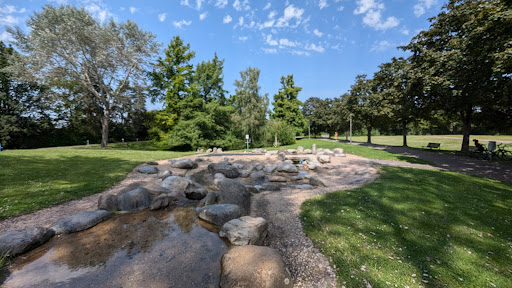 Der Park ist weitläufig, sauber und abwechslungsreich gestaltet. Es gibt zwei separate Kinderspielplätze, ein Basketballfeld, ein Beachvolleyballfeld, ein Fußballfeld sowie einen großen See mit Springbrunnenfunktion. Außerdem gibt es ein paar Infoschilder, welche allerdings mal erneuert werden müssten, da man ihnen ansieht, dass sie schon in die Jahre gekommen sind. Außerdem gab es eine Art steinigen Bachlauf ohne Wasser, dessen Funktion ich nicht so ganz verstanden hab. Dafür konnte man anhand einer Karte verschiedene Bäume finden (Baumlehrpfad), was eine gute Challenge zum Zeitvertreib sein kann. Jedoch könnte es ein paar Bänke und Mülleimer mehr geben. Ausreichend Parkplätze und Fahrradabstellmöglichkeiten sind vorhanden. Man kann sich sogar eine Grillhütte dort mieten und im Imbiss was Essen sowie Minigolf spielen. Wir kommen...