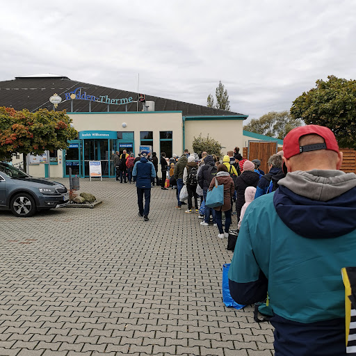 Read moreDa laut Wetterbericht es die nächsten Tage regnen sollte, haben wir uns entschieden die Boddentherme zu besuchen. Aber erst zum späten Nachmittag damit es nicht zu voll ist, vorher waren noch in einen leckeren Cafe. Darüber habe ich auch schon eine Rezension geschrieben. „Alte Dampfbäckerei“ sehr zu empfehlen. Der Plan ging auf jeden Fall sehr gut auf. Wir waren vorher Kaffeetrinken/Kakao & Kuchen essen. Gegen 16 Uhr waren wir in der Therme, Parkplätze sind leider nicht so viele vorhanden bzw. auch einige vermietet. zusätzlich kosten die Parkplätze 1€ die Tageskarte bzw. für 24h und man darf nur 50 Cent Stücke oder direkt 1 € reinwerfen. An der Kasse war nur eine Familie vor uns, und die Leute die ab und zu schon raus wollten, also wir waren so innerhalb von 10 Min. drin. Die Therme ist sehr übersichtlich und man verläuft sich nicht so wie in anderen Thermen. Wir hatten auch ein Fach für die Handtücher bekommen sowie 2 Liegen. Den Kindern hats gut gefallen, klar es hätte noch eine Rutsche mehr sein können. Es gibt ein 1-Meter Sprungbrett welches abwechselnd mit dem 3-Meter Sprungturm benutzt werden kann, ich glaube es war immer 30 Minuten im Wechsel. Ansonsten kann man seine Bahnen Schwimmen mit Startblock. Die Tiefste Stelle ist 3,80m Dann gabs noch ein Wellenbecken und ein Strudel oder Strömungskanal. Ich finde das reicht völlig. Es riecht nicht übertrieben nach Chlor, jedenfalls ist mir überhaupt nichts aufgefallen, man sieht keinen Rost, oder sonst irgendwelche Mängel. Über das Bistro können wir nichts sagen, da wir ja vorher eine Kleinigkeit gegessen haben. Die Kinder haben auch Gott sei dank nicht über Hunger geklagt. Wir waren bis ca. 19 Uhr im Wasser. In der Dusche fand ich die gefliesten Ablagen sehr gut, für shampoo, duschgel etc. Auch das bei meiner Dusche das Wasser so lange lief, hat mir gefallen. Ich würde hier nur größere Handtuchhalter oder fächer favorisieren, vielleicht könnte man den Verbesserungswunsch umsetzen. Wir kommen auf jeden fall nochmal wieder. Der Eintrittspreis passt hier für 2 Erwachsene + 3 Kinder für den ganzen Tag. Handy Nutzung im Bad nicht gestattet! Der Bademeister spricht...