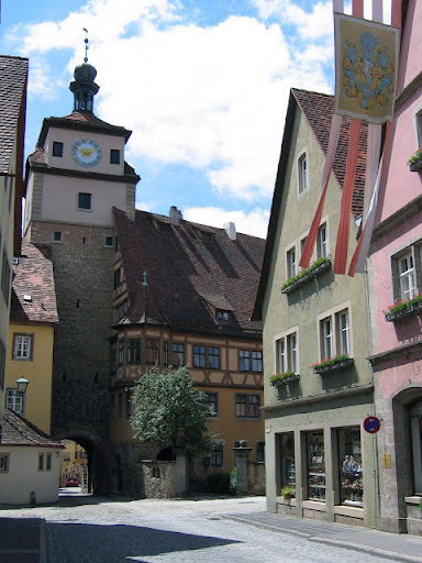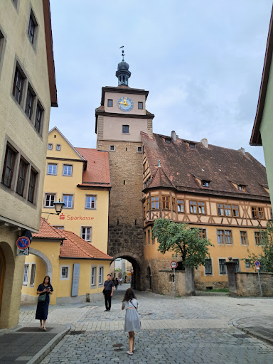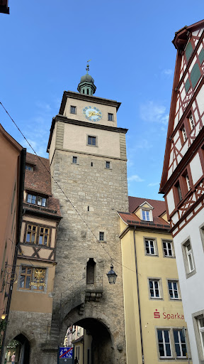 Ho visto questa torre con la mia ragazza in occasione di una giornata a Rothenburg ob der Tauber. La costruzione è subito riconoscibile dal colore chiaro. Sulla cima è presente un orologio con lancette e numeri dorati su sfondo azzurro. Alla base è presente una porta a volta in pietra da dove si può passare a piedi per raggiungere il centro cittadino. Un posto caratteristico grazie anche alle casette...