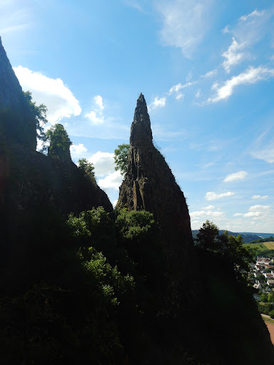 Read moreThe 327 meter high Rotenfels, at the top a gentle wooded area, breaks off towards the Nahe in a mostly vertical rock face, furrowed by deep, steep and dark ravines and lined with bizarre towers and turrets. At over 200 meters high, this south face is the highest rock face between the Alps and Scandinavia. While it has a number of climbing routes, it still allows hikers to take a scenic walk along the abyss. And it offers very ambitious hikers with a lot of experience on fragile T6 routes and the appropriate equipment impressive and adventurous climbing options in...