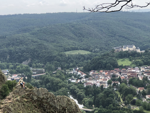 This specific Google Maps location is a lookout point along the rock wall face of the Rotenfels. At this location there is a landing with a sturdy stone fence (except for a small segment which consists of a wooden pole and a massive gap underneath that any child could fall through) with stunning views of the rest of the Rotenfels, as well as Bad Kreuznach. There is a cross in the middle of this landing, and a small tree which offers some shade, and two benches. This site takes a few extra minutes from the main walking path up to the highest point of the Rotenfels, so I certainly recommend coming here if you area already hiking the Rotenfels. I will post my review for the entire (child-appropriate) hike we did on Rotenfels below, which I already posted on the actual Rotenfels mountain location. Please see my review for "rotenfels" for more information on doing this hike with...