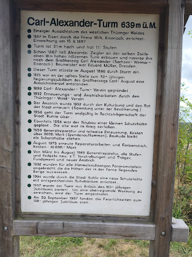 Read moreWir waren am Wochenende auf dem Carl-Alexander-Turm. Der ausgeschilderte Parkplatz am "mini a thür" war der perfekte Ausgangspunkt für eine kleine Wanderung. Das tolle ist, dass man auch einen Rundwanderweg laufen kann und auf halber Strecke auf den Turm trifft. Eine tolle Erfahrung und sehr eindrucksvoll. Wir konnten sogar bis zum Brocken im Harz schauen. Sehr zu empfehlen und definitiv eine der schönsten Wanderungen in Ruhla. Wir...