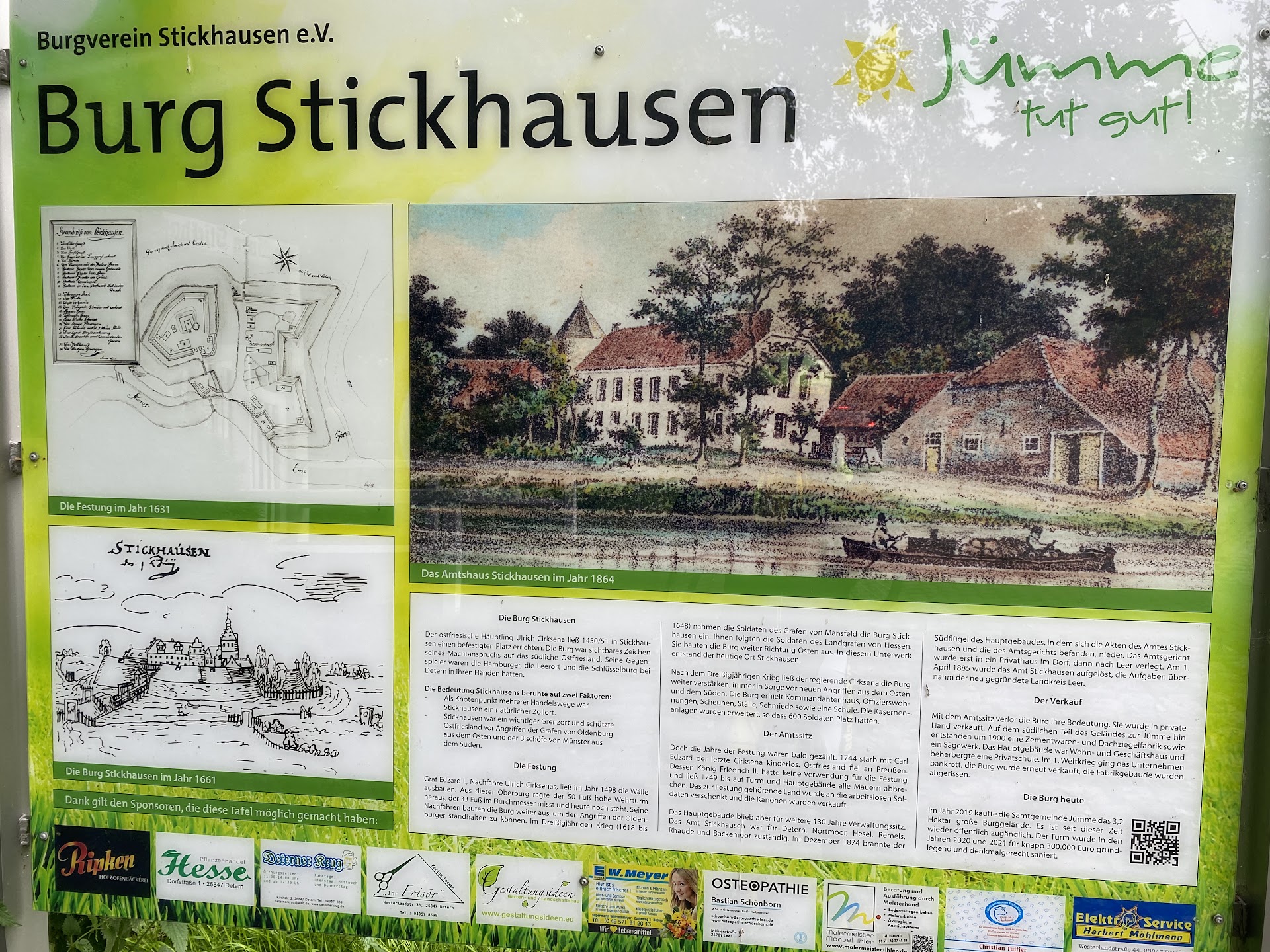 Die Burg Sickhausen liegt an der Jümme in Stickhausen (Ostfriesland), Samtgemeinde Jümme im Landkreis Leer in Niedersachsen. Die Burg Stickhausen stammt aus dem 15.Jahrhundert wurde schon als Festung genutzt, nun befindet sich im Turm ein Museum. Der Turm wurde im Jahre 1498 erbaut. Früher gehörten noch Kommandanten/-Offizierswohnungen, Kasernen, Ställe, Scheunen, eine Schmiede sowie eine Schule dazu. Nur 100 Jahre später wurde alles bis auf dem Turm und Hauptgebäude abgerissen. Die Burg Stickhausen gehört seit 2019 der Samtgemeinde Jümme. Das Burggelände ist ganzjährig zugänglich. Der Turm kann von Ostern bis Oktober besichtigt werden. Ein interessanter Ort mit viel historischer Geschichte (ein Besuch ist lohnenswert). Diese Bewertung wurde nach eigener...