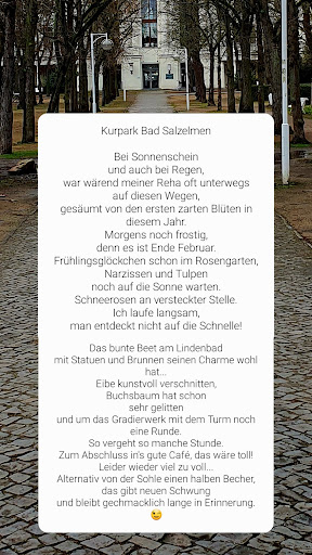 Bei Sonnenschein und auch bei Regen, war wärend meiner Reha oft unterwegs auf diesen Wegen, gesäumt von den ersten zarten Blüten in diesem Jahr. Morgens noch frostig, denn es ist Ende Februar. Frühlingsglöckchen schon im Rosengarten, Narzissen und Tulpen noch auf die Sonne warten. Schneerosen an versteckter Stelle. Ich laufe langsam, man entdeckt nicht auf die Schnelle! Das bunte Beet am Lindenbad mit Statuen und Brunnen seinen Charme wohl hat... Eibe kunstvoll verschnitten, Buchsbaum hat schon sehr gelitten und um das Gradierwerk mit dem Turm noch eine Runde. So vergeht so manche Stunde. Zum Abschluss in's gute Café, das wäre toll! Leider wieder viel zu voll... Alternativ von der Sohle einen halben Becher, das gibt neuen Schwung und bleibt gechmacklich lange in...