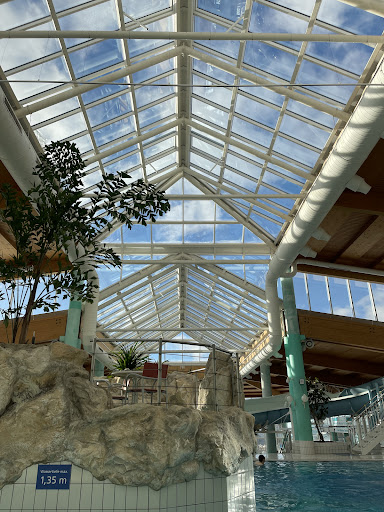 Read moreÜber Haupteingang des Hotels, keinerlei Ausschilderung, wie man zur Bade- und Saunalandschaft gelangt. Man muss durch ein hässliches Treppenhaus (wenn die Begebenheiten so sind, kann man dennoch auch so ein ungemütliches Treppenhaus freundlich gestalten, aber es war lieblos und wirkte eher wie eine Abstellfläche für Tische, Kartons, Malereimer). Badelandschaft in Ordnung, sehr glatte Fliesen (wirklich gefährlich), tolle Rutschen, schöne Grotten, Whirlpool und stündlich Wellenbad, leider viele Treppen (Rutschgefahr), Wassertemperatur etwas kühl, aber o. K. Keinerlei Imbiss außer ein Snackautomat mit ungesunde Süßigkeiten, der nur teilweise funktioniert. Veraltete Spinde (Rostige Flecken, keine Ablage Möglichkeit, umständliche Armbänder mit Schlüssel). Der Großteil der Schränke hat schon keine Schlüssel mehr oder die Schlösser fehlen. Haartrockner funktionieren nur teilweise. Zur Saunalandschaft gibt es im Umkleidebereich ein Schild, dann steht man im Gang vor vielen Branschutztüren ohne Beschriftung und bei irgendeiner dieser Türen ist das Schloss blockiert (darf brandschutztechnisch nicht sein!!) - siehe da, die Saunalandschaft. Bei den Duschen/Toiletten keinerlei Hinweis was Männlein/Weiblein ist, merkt man erst, wenn man als Frau vorm Pissoir steht. Die Saunalandschaft wie der Rest der Anlage im 90er Jahre Charme. Weiße Fliesen, einfache Klappliegen, auch hier keinerlei Imbissmöglichkeit. Als uns der Magen zu sehr knurrte, stiegen wir das unschöne und kalte Treppenhaus nach oben (hier werden Tische gestapelt, alte Kartons stehen in der Ecke und Kabel ragen aus den Wänden, wo anscheinend mal Lampen angebracht waren) und saßen im Bademantel in der zugigen Empfangshalle, wo ständig die Türen auf- und zugingen. Natürlich gab es dort zur Nachmittagzeit keinerlei warme Gerichte. Wir hatten die Wahl zwischen Kuchen und Eis. War nicht das, was wir wollten, aber der Hunger war zu groß. Die Mitarbeiter waren freundlich und da kaum Gäste da waren, erhielten wir auch sehr schnell unsere Bestellung. Wenn man einen Tag in der Sauna oder im Bad verbringen möchte, bekommt man doch Hunger und Durst!!! Ein kleines Imbissangebot mit Suppen, Pizza, Würstchen, Sandwiches oder Würzfleisch sollte doch auch tagsüber machbar sein. Das ist echt kein Service. Wer bleibt da länger als 2 Stunden??? Die Saunen selbst waren klassische finnische Saunen, sowie ein Dampfbad. Das war in Ordnung. Der Ruheraum ebenfalls mit einfachen Klappliegen. Etwas Wellness-und Spamusik, ein paar Düfte und kein liebloser Plastikweihnachtsbaum würden der Atmosphäre gut tun. Es war nicht viel los. Also konnte wir unsere Handtücher auf den Liegen lassen. Der Aufguss was gut, die Mitarbeiterin wedelte auch ordentlich und war sehr freundlich. Die Duschköpfe (auch im Bad Bereich) sind schon in die Jahre gekommen (Rost, Ablagerungen). Alles in allem aber leider kein Ort, wo man unbedingt regelmäßig wiederkommt. Für 21 Euro Tageskarte Bad und Sauna ist zwar o. K., aber da es keinerlei Speisenangebot im Bad-und Saunabereich gibt, bleibt man wohl kaum den ganzen Tag. Schade, dann gehen wir eben...