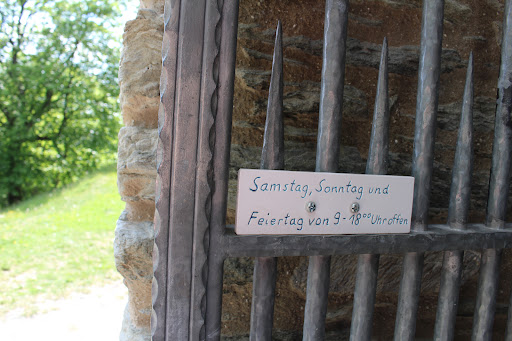 I have found the tower of Rapunzel: It really has no entrance. According to the people there who were celebrating in the hut next door, only the castle society can get in there with the help of a ladder. Next to it is a former residential tower, where the interior and a wall are missing. It can be climbed on Saturdays, Sundays and holidays, at least that is what it says. The view up there must be magnificent - and exhausting. Afterwards you can go to the only coffee shop where you can eat good...
