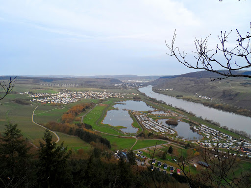 Hier steht man direkt am Zaun eines Campingplatzes. Es geht nun im Uhrzeigersinn um das Gelände herum: Erst ein Stück moselabwärts, bis zu der Stelle, an die man noch mit dem Auto herankommt, dann rechts, an einem kleinen Bach entlang. Bald über den Bach und südwärts den Hang hinauf zu einer Gaststätte, bei der sich ein Spielplatz befindet. Hier endet auch eine Sommerrodelbahn, die man schon von Weitem fast ebenso gut sehen kann wie eine große Autobahnbrücke hoch oben am Berg.