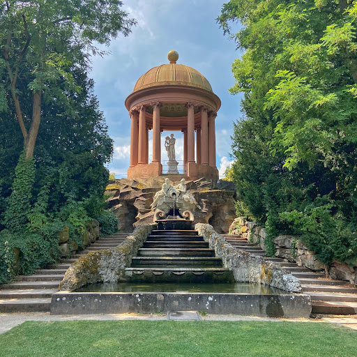 From Orangerieparterre opens a wonderful view of the natural theater with the Apollo temple. Nicolas de Pigage created the fascinating ensemble between 1761 and 1775. In this impressive setting, concerts and theatrical performances took place during the summer.In 1762, a belvedere was planned here. After the design of Nicolas de Pigage a high, terraced substructure was built, on whose uppermost platform a monopteros , a round temple with twelve pillars of ionic order without Cella rises. The temple is dedicated to the Greek god Apollo . The statue of Apollo comes from the sculptor Anton von Verschaffelt . It shows the god in the left-handed lyre game, which brought the artist some scorn. In an exchange of correspondence between Gleim , Wilhelm Heinse and Johannes von Muller , it is said that he is " even sacred"On a hill," only the left god has a miserable bottom in it ". The Apollo Temple crowns a two-sided complex: from the entrance on the west side, the visitor climbs through rocky, dark and confusing corridors to the light-flooded platform with the classic Monopteros. From the point of view of the audience in the eastern Heckentheater the temple crowns the stage prospectus. Apollo appears as god of the arts and leader of the muses on Mount Helikon , where the Pegasus hoofbeats the source Hippocrene , whose water is passed through the Naiads through the cascade to the people. Above the natural theater, a small round temple rises on artificial rocks. He is dedicated to Apollo, the god of light and the fine arts. Inside, the marble, lyras-playing god still watches over what's going on in the natural theater at his feet. The Temple of Apollo can only be reached via a branched network of irregular steps or via the cave-like passages in the rock base. As if out of darkness, the path leads man to the light. The Temple of Apollo offers a wonderful view of the natural theater, the adjacent Orangerieparterre and the surrounding landscaped garden. The depiction of the sun motif on the railing of the upper terrace refers to Apoll's function as...