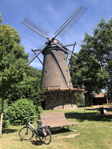 Schön gelegene Mühle mit einer Liegebank davor schon zum dritten Mal dorthin mit den Rad um nach dem Essen in der Börse anschließend eine Pause zu machen hinter der Mühle ein schöner Weg mit zwei weiteren Bänken Spielplatz u etwas weiter ein kleiner See ( Teich mit holzplattformen zum Sonnen o die Ruhe zu genießen !...