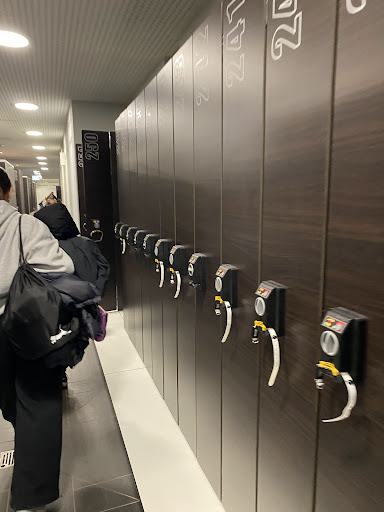 Als wir uns umgezogen hatten, gab es leider nur noch ein freies Schließfach. Wir sind den ganzen Bereich abgeloffen, aber zu dieser Zeit gab es kein zweites. Das war unpraktisch, denn man braucht das Armband des Schließfach für die automatischen Drehkreuze. Da wir kein weiteres Schließfach fanden, quetschten wir uns also zu zweit durch die Drehkreuze.