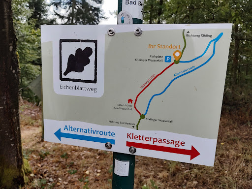 Read moreHoeveel water er in de waterval staat is echt weersafhankelijk. Wij kwamen aan het einde van de zomer met maar een klein beekje terecht. Ondanks dat is de route en omgeving geweldig. Geparkeerd op de parkeerplaats vanaf Kliding (zie Google parkeerplaats). Vanwege het vochtige weersomstandigheden gekozen de heenweg via de blauwe alternatief te lopen. Deze route is weinig aan, glooit als een breed pad langzaam naar beneden langs de beek. Einde van beide routes (het rode en blauwe pad) is echter de bovenkant van de waterval. Dat levert voor sommige mensen slecht ter been een teleurstelling op want, begint het echte feest pas om bij de onderkant van de waterval te komen. Dit komt echt overeen met een klimbos, met touwen over de steile helling naar beneden (en terug). Vanuit de onderkant van de waterval kun je nog verder richting Bad Bertrich met eveneens een steile klimroute. De rode route is iets minder uitdagend dan richting de onderkant van de waterval, desondanks nog steeds stijl en ook touwen aanwezig. Onderweg kom je nog een paar leuke uitzichtpunten tegen en de SchutzhĂŒtte waar wat tafeltjes in zitten. Op het kaartje is het steilste stuk alleen tussen de Schutzhutte en de waterval. De kilometer naar de parkeerplaats is weer...