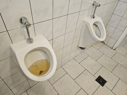 Männertoilette: ein von zwei Pissoirs verstopft und überflutet.