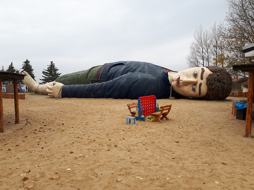Draußen stehen und liegen dann eben übergroße Kunststofffiguren herum, nebst einer kleinen Rutsche und einem Hüpfkissen. Ein kleines Cafe für die Erwachsenen oder Snacks? Fehlanzeige.