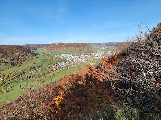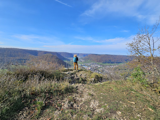 Vom Oberbergfels hat man einen schönen Blick ins Filstal. 200 m weiter trifft man auf den Eckfelsen mit einem Gipfelkreuz. Auch hier öffnet sich wieder eine...
