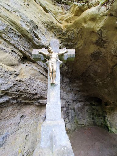 Ein Ort der Ruhe in wilder Natur. Seit mindestens 500 Jahren ist es ein bekannter Wallfahrtsort. Angeblich soll hier der Ritter Albero von Bodmann nach der Rückkehr und Gefangenschaft aus einem Kreuzzug hier eine Kapelle errichtet haben. Die heutige Kapelle stammt aber aus moderner Zeit. Die Sandsteinhöhlen oberhalb der modernen Kapelle wirken viel älter und sollte man sich nicht entgehen lassen. Vor allem im Sommer ist der Einstieg beim Vorbeigehen leicht zu übersehen. Auf der rechten Seite findet man eine im rechten Winkel herausgeschlagene Sandsteinwand mit zahlreichen Bearbeitungsspuren. So manches Loch muss hier ehemals einen hölzernen Balken oder Pfahl getragen haben. In der Mitte befindet sich eine große Aushöhlung passend für eine Marienfigur. Mit großer Wahrscheinlichkeit stand an diesem Platz einst ein Hölzerner Anbau vermutlich sogar der alte Standort der Kapelle. In der Mitte befindet sich eine kleine Höhle mit einer gehauenen Ablage im Sandstein. Auch hier finden sich zahlreiche Bearbeitungsspuren. Zahlreiche künstliche Nischen und der Eingang war vermutlich verschließbar worauf die seitliche Balkenvertiefung am Eingang hindeutet. Vielleicht die Wohnstätte eines einfachen Bediensteten oder eines einfachen Geistlichen. Die Interessanteste Höhle ist die linke mit dem großen angebrachten Kreuz. Sie ist in mehrere Abschnitte unterteilt und war mit ihrer Größe am Ende Richtung Kapelle vermutlich sogar 2 stöckig womit die Öffnung in der Decke auch einfach begehbar gewesen wäre. Zahlreiche in den Sandstein geschlagene Vertiefungen weißen auf hölzerne Konstruktionen in der Höhle hin. Vermutlich war sie von außen bis auf wenige Lichteinlässe mit Holz verkleidet. Vielleicht war die Höhle sogar ein ehemaliger Adelssitz worauf die hochwertige Bearbeitung des Inneren hindeuten könnte. Leider haben hier Schmierfinken ihre Namen im Raum überall hinterlassen und vermutlich ältere künstlerische Gestaltungen zerstört oder verfälscht. Ein Rätsel ist auch der zugemauerte Eingang links oberhalb des Pavillons. Ein sehr alter Ort dessen Geschichte man...