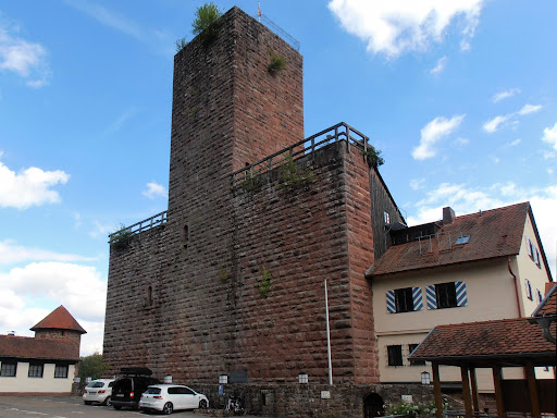 Darin geht's um den furchterregenden Riesen Erkinger, der den Turm hat bauen lassen. Über vier Meter soll er groß gewesen sein! Mit zwei Gesellen zusammen hat er als Räuber und Menschenfresser in der Umgebung sein Unwesen getrieben. Mit besonderer Vorliebe verschlang er die eben getrauten Bräute vom Hochzeitsmahl. Logisch, die sind dann ja auch lecker gefüllt! Nach dem Mahl soll er dann ihre Gebeine weit aus dem Fenster geworfen haben, bis ein Berg aus Gebeinen aufgehäuft war, der heutige Beinberg.