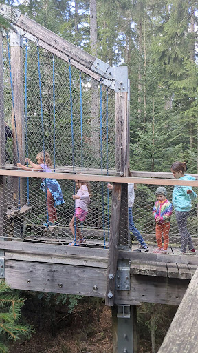 Along the trail, there are various activity stations. Some are about the forest and local wildlife such as one where you can listen to bird calls and another where you can identify animal tracks. Other activity stations are like mini-obstacle courses where you can walk a narrow plank or cross a rope bridge. (There are all enclosed; there is no danger of falling.) The little breaks were just right to keep my children from becoming bored with the walk.