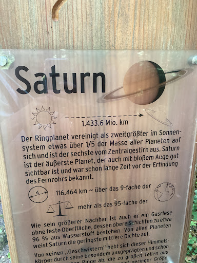 Read moreDer Planetenpfad ist ein sehr schöner Pfad. Der Startpunkt bietet einen schönen Spielplatz, der auch für etwas größere Kinder (6-11 ) Spaß bietet. Die Modelle des Sonnensystems sind schön gearbeitet und es sind tolle Infos auf den Tafeln zu finden. Ganz besonders fällt der Maßstab und die Entfernungen unter den Planeten auf. Da versteht man etwas besser, um welche extremen Dimensionen es sich im Sonnensystem handelt.
