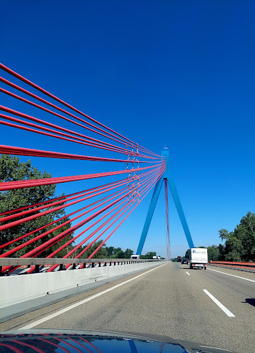 Read moreA triangle shaped hanging bridge attached with red supporting rods. A very beautiful view while traveling on the A61 Speyer...