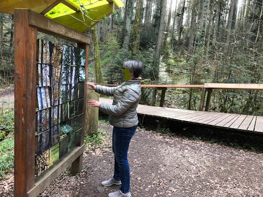 Die Idee ist gut. Der Ort ist schön. Die Umsetzung ist unterirdisch. Es fängt bereits mit dem "nichts ist ausgeschildert" an. Auch wenn man annähernd nachm Navi angekommen ist, steht nirgends sichtbar wohin man soll. Für Auswärtige heisst es, es ist nicht gewollt, dass man dahin kommt. Unterwegs von unten nach oben sind immer wieder kaputte Latten dabei, die wackeln und zum teil bröseln. Und das heisst dann Kinderwagen tauglich. Alle Ferngläser die aufgestellt sind, sind kaputt. Die Hälfte der Stationen ist beschädigt, z b einzelne Teile von der Puzzlewand Waschbär. Mitten im Wald stehen Süßigkeitenautomaten, die angeblich Wandfrüchte beinhalten, dabei verkauft man süsis. Für was denn das? Oben angekommen. Ein wunderschöner Wasserspielplatz. Was ist mit Sonnenschutz? Bei 30 Grad sind Kinder direkt in der Sonne ohne 1 cm Sonnenschutz. Die ganzen Bänke am Spielplatz riechen nach Urin. Ich hab auch nirgends Toiletten gesehen. Also wird dort direkt in Gebüschen gepinkelt. Also des ganze Konzept ist einfach nicht zeitgerecht. Da fehlen Sachen die eigentlich...
