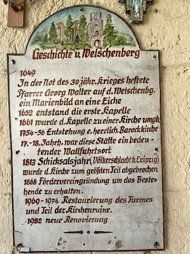 Ein wunderschöner, friedlicher Platz ,hier an diesem gesegneten Ort ,der Ruhe und der Stille mitten im Wald oberhalb von Mühlheim. Wo ist man Gott näher als hier zwischen den geschichtsträchtigen alten historischen Mauern . Die ehemalige Wallfahrtskirche „Maria Hilf“ auf dem Welschenberg geht auf das Jahr 1649 zurück. Nach dem Dreißigjährigen Krieg ließ der Mühlheimer Pfarrer Georg Walter ein Marienbild an einer Eiche auf dem Welschenberg anbringen. Eine erste Kapelle wurde 1652 errichtet. Dorthin pilgerten in der Folgezeit jährlich Zehntausende Gläubige auch aus dem weiten Ausland. 1658/60 wurde bereits die Kirche Maria Hilf erbaut, 1755/60 eine Kirche im Barockstil. Mit dem Verbot von Wallfahrten durch König Friedrich von Württemberg endete 1811 auch diese lange Tradition auf dem Welschenberg. Die Kirchengebäude wurden auf Abbruch verkauft, 1905 wieder eine Kapelle am Turmfuß erbaut. Seit 1968 werden Renovierungsarbeiten an der Kirchenruine...