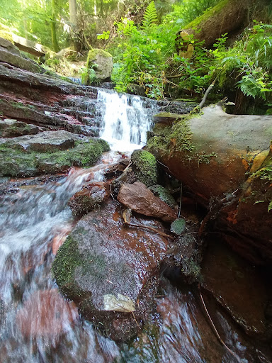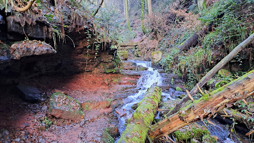 Read moreDie Wolfsschlucht ist ein etwa einen Kilometer langes Kerbtal, das das Schlossbächlein in den Buntsandstein gegraben hat. Auf dieser Strecke überwindet der Bach etwa 270 Höhenmeter in seinem schmalen, mit Geröll verfüllten Bett. Er fällt dabei öfters in mehrere Meter hohen Abstürzen über Felsbänke herab, auf der engen Talsohle, die zuweilen beidseits von Felswänden oder -überhängen begrenzt wird, liegen an Felswände gelehnt oder über Blockschutt abgestürzte und bemooste Baumstämme, deren Bewuchs vom beständigen Sprühnebel befeuchtet wird. An steilen Erdhängen rutschen oft Partien ab.Dennoch gibt's einen - mit Stahlseilen gesicherten - Pfad, der sich durch das enge Tal schlängelt, über glitschige Felsbrocken und unter abgestürzten Baumstämmen hindurch. Ein Warnschild warnt vor einem "alpinen Klettersteig" - das sollte man allerdings nicht ernst nehmen. Klettern muss hier niemand, und die Alpen sind woanders.