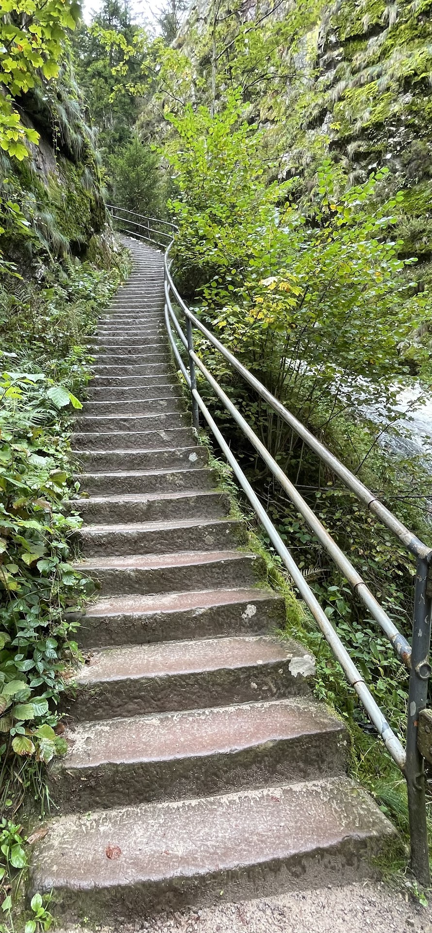 Schon zu Beginn der Wanderung wurde klar, dass dies kein gewöhnlicher Spaziergang durch die Natur werden würde. Der Pfad führte zunächst durch dichte Vegetation, die fast den gesamten Weg säumte. Als ich auf eine steile Steintreppe traf, die sich an einer Felswand entlang nach oben schlängelte, wurde die Wanderung anspruchsvoller. Diese Treppe, gesäumt von einem schmalen Geländer, bot eine atemberaubende Aussicht auf die umgebende Felslandschaft. Links und rechts ragten grüne Wände empor, die von Moos und kleinen Sträuchern bedeckt waren. Es war, als ob die Natur diesen Ort vollständig umschlungen hätte, und das leise Rauschen des nahen Baches begleitete mich auf Schritt und Tritt.