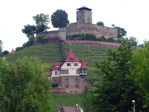 Burg Hohenbeilstein is fronted by a picturesque winery. You are somebody when your turrets sport dragon spigots. That probably comes castle estate status. A segment of leftover town wall links the estate with the castle. The somewhat shamefaced building commission, a wheelchair correct access is in the works. (The main gate to the falconry is wheelchair rated.) The 'Forstlagerbuch' from Andreas Kieser (Württemberg's version of the Doomsdaybook done after the 30 Years War) shows a roughly triangular town wall defined by three anchor points, the Hohenbeilstein at the hilltop and two gatetowers on the valley side. Shorthand, a Roman balance loaded on one side by a bucket full of half-timbered houses and on the other by a castle. The winery and a church halfway up the hill did mark the fulcrum points.
