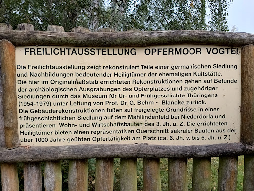 Read moreWer den Mittelpunkt Deutschlands besucht sollte sich die ehemalige Ausgrabungsstätte Opfermoor incl. dazu gehörendem Museum mit einplanen. Geschichtliche Hintergründe findet man im Netz, weswegen ich mir das an dieser Stelle schenke. Das Museum selbst zeigt viele interessante Fundstücke - zum Teil auch Repliken - und sehr viel Hintergrundinformation. Es werden außerdem die wichtigsten Akteure und zeitlichen Abläufe der Ausgrabungen vorgestellt. Das Freigelände zeigt mehrere Häuser und (vermeintliche) Kultstätten, welche in wirklich liebevoller Handarbeit nachgebaut wurden. Wenn man außerdem den ziemlich niedrigen Eintrittspreis bedenkt, sollte man, wenn man ohnehin in unserem schönen Thüringen weilt, sich dieses Kleinod auf keinen Fall...