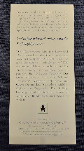 Well structured regional history museum with plenty information and exhibits. Some multimedia presentations add to the experience and even smaller kids can enjoy this self financed museum. Twice in a week one can participate in the traditional coffee table (Bergische Kaffeetafel). And a regional dialect group is meeting there welcoming guests (advanced German language skills...
