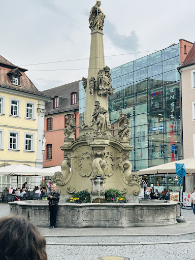 What you see is a obelisk with a bronze coat of arms and topped by the Patron Saint of Fraconia. At the base of the obelisk are female figures representing (wisdom, temperance, justice & strength), below which are for dolphins from which water spills from their mouths into a ground level basin. It is an ornate fountain that is well worth viewing for a couple of minutes when sightseeing in this area...