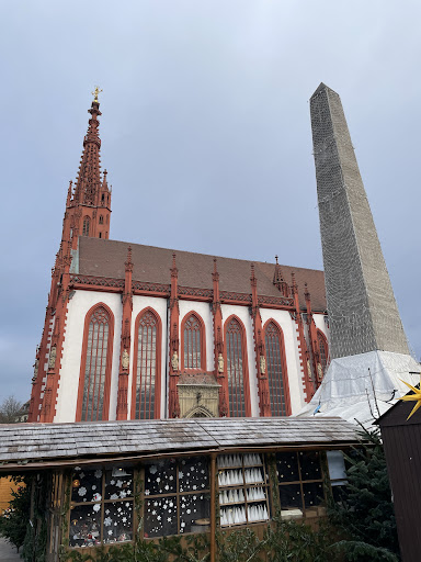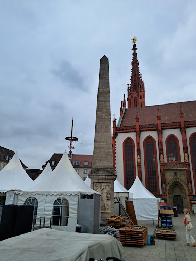 We visited Würzburg during December. At that time the base and lower level of the Obelisk Fountain were covered up. However, there were lights strung up around the Obelisk that were turned on in the evenings during the Christmas Market, adding ambience to the festival environs...